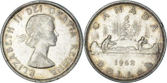 | | Coin, Canada, Elizabeth II, Dollar, 1962, Royal Canadian Mint, Ottawa | | | Laureate bust right, Voyageur, date and denomination below, All genuine circulation strike 1955 Arnprior dollars have a die break running along the top of TI in the word GRATIA on the obverse., Mary Gillick | | FEATURES |