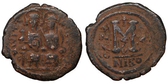 Justin II. 565-578. Æ follis. 12.35 gr. – 30.1 mm. Justin, holding globus cruciger, and Sophia, holding cruciform scepter, seated facing on double throne / Large M; above, cross; across field, date (A/N/N/O); NIKO. DOC 92a; MIBE 46; SB 369. Well centered. VF+