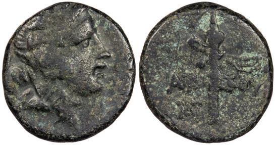 AE17 4.28g. 17mm. Struck under Mithradates VI Eupator. Head of Dionysos r., wearing mitra and ivy wreath. Filleted thyrsos, legend to either side; monogram to l. below. AMI-SOU HGC 7, 251; SNG Black Sea 1192-5 Fairly rare. Dark green patina. Mild porosity. From the Southwood Collection.