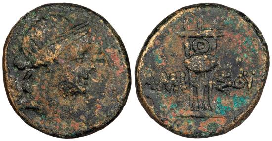 AE21 8.10g. 21mm. Struck under Mithradates VI Eupator. Head of Artemis r., wearing stephane, bow and quiver over shoulder. Tripod; legend to either side. AMI-SOU HGC 7 240; SNG Black Sea 1139-40 Dark brown mottled patina. Mild roughness and adhesions. From the Southwood Collection.