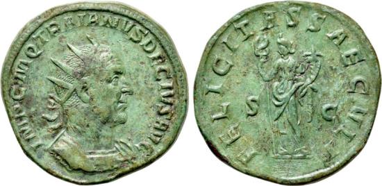Obv: IMP C M Q TRAIANVS DECIVS AVG. Radiate and cuirassed bust right. Rev: FELICITAS SAECVLI / S - C. Felicitas standing facing, holding caduceus and cornucopia.
