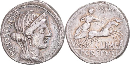 | | Coin, Marcia, Denarius, 82-81 BC, Rome, , Silver, Crawford:360/1 | | | Pub. Crepusius, C. Mamilius Limetanus, and L. Censorinus., Veiled, diademed, and draped bust of Venus right., Venus driving biga right; control number above., Beautiful iridescent toning with blue reflections on the obverse and golden tones on the reverse. | | FEATURES |