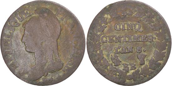 | | Coin, France, Dupré, 5 Centimes, An 8/6, Strasbourg, , Copper | | | Draped bust of Liberty on the left wearing a Phrygian cap., Value, date and mint mark in an oak crown., Rare variety with the "AN 8" re-engraved on a 6. | | FEATURES |
