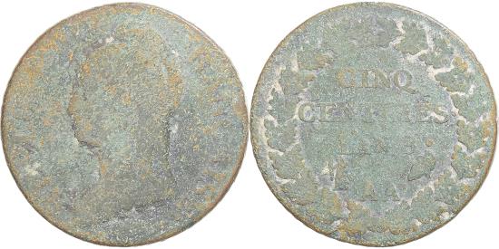 Coin, France, Dupré, 5 Centimes, AN 8, Metz, , Copper, Gadoury:126aCoin, France, Dupré, 5 Centimes, AN 8, Metz, , Copper, Gadoury:126a