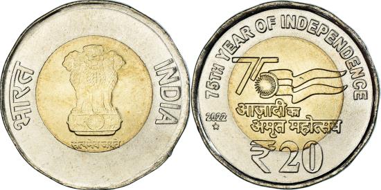 | Coin, INDIA-REPUBLIC, 20 Rupees, 2022, 75th Year of Independence, |