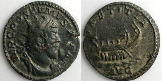 Postumus, AD 259-268, Antoninianus. SR 10958, Laetitia Aug., galley. 2.14g., 20mm. VF dark toning as shown.