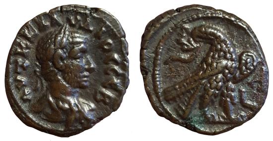 Obv: ΑΥΤ Κ ΚΛΑΥΔΙΟΣ ΣΕΒ, Laureate, draped and cuirassed bust r. Rev: Eagle standing r., palm on far wing and holding wreath in beak; in field, L-A (Year 1)