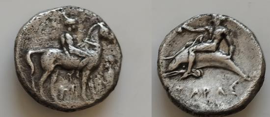 | CALABRIA, Tarentum. Circa 365-355 BC. AR 21mm Nomos (7.7 gm). Nude youth on horseback right; ithyphallic herm with its head tied with a fillet before, TE below / TARAS, Dolphin |
