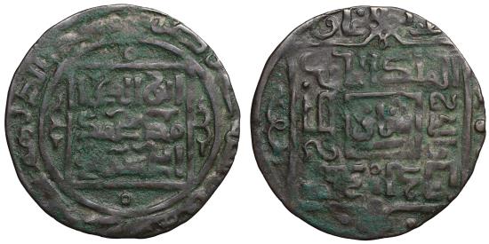 Amirs of Balkh. Abu'l-Mujahid Muhammad al-Husayni. Circa AH 617-618 / AD 1220-1221. Broad Dirham. CU/BI 31.5mm, 4.86 g, 6h. Album 1753.2. Brown and green patina. Rare. VF\XF