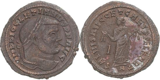 | | Coin, Diocletian, Follis, 303, Carthage, , Copper, RIC:VI-33a | | | Head of Diocletian, laureate, right., Carthage, wearing long robe, standing front, head left, holding fruits in both hands., IMP DIOCLETIANVS P F AVG, SALVIS AVGG ET CAESS FEL KART | | FEATURES |