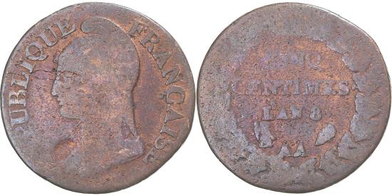 | | Coin, France, Dupré, 5 Centimes, AN 8, Metz, , Copper, Gadoury:126a | | | Draped bust of Liberty on the left wearing a Phrygian cap., Value, date and mint mark in an oak crown. | | FEATURES |