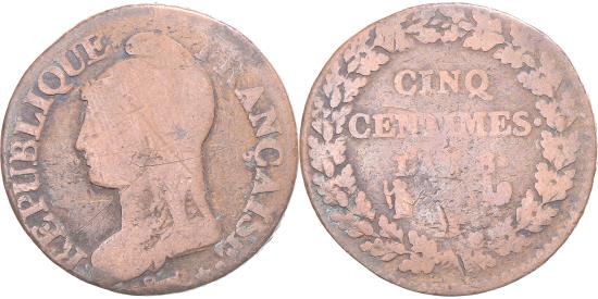 | | Coin, France, Dupré, 5 Centimes, AN 8, , Copper, Gadoury:126a | | | Draped bust of Liberty on the left wearing a Phrygian cap., Value, date and mint mark in an oak crown. | | FEATURES |