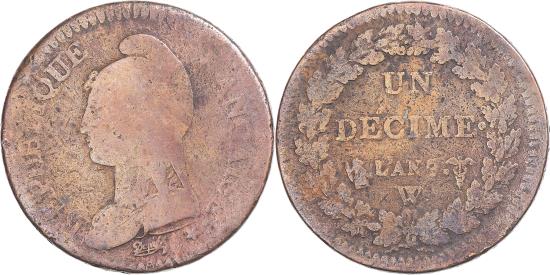 | | Coin, France, Dupré, Decime, AN 7/5, Lille, , Copper, Gadoury:187 | | | Draped bust of Liberty on the left wearing a Phrygian cap., Value, date and mint mark in an oak crown. | | FEATURES |