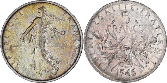 | | France, Semeuse, 5 Francs, 1966, Paris, , Silver, KM:926, Gadoury:770 | | | Semeuse, Figure sowing seed, Branches divide denomination and date | | FEATURES |