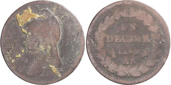 | | Coin, France, Dupré, Decime, AN 8, Metz, , Copper, Gadoury:187a | | | Draped bust of Liberty on the left wearing a Phrygian cap., Value, date and mint mark in an oak crown. | | FEATURES |