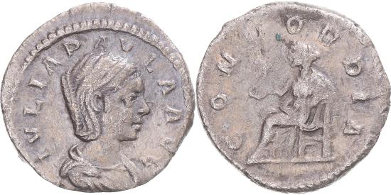 | | Julia Paula, Denarius, 219-220, Rome, Silver, , RIC:211 | | | Bust of Julia Paula, hair waved and fastened in plait, draped, right, Concordia, draped, seated left, holding patera in extended right hand; in field, star, Rare denarius of the first wife of Elagabalus, Julia Paula, whose marriage was arranged by Julia Maesa. But the emperor quickly divorced her to marry a vestal Julia Aquilia Severa. She left public life after that. RIC IV Elagabalus 211, IVLIA PAVLA AVG, CONCORDIA | | FEATURES |