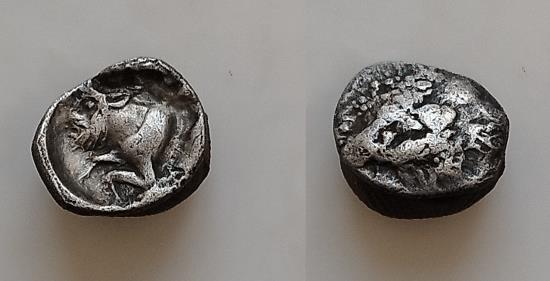 SICILY, ?? Circa 5 century BC. AR 9mm Litra 0.61 gm. Uncertain !! Very rare !! ???? / Forepart of man-headed bull Left . Very Fine . Very rare !!