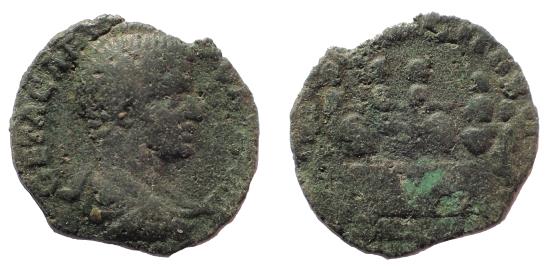 Geta. As Caesar, AD 198-209. Æ As 22 mm. 3.8 gm. Contemporary Gallic imitation of Rome mint issue of AD 205. Obv: GETA CAES PONT COS, Bareheaded and draped bust right. Rev: FELICITAS SAECVLI / S - C, Septimius, Caracalla, and Geta seated right on platform, officer before; citizen standing left at foot of platform. For prototype, cf. RIC IV 126 and BMCRE 834.