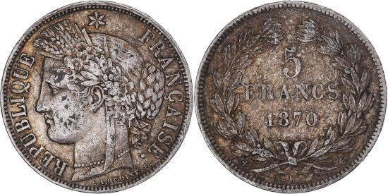 | | Coin, France, Cérès, 5 Francs, 1870, Bordeaux, , Silver, KM:818.2 | | | Cérès, E. A. OUDINE F. below truncation, Denomination within wreath | | FEATURES |