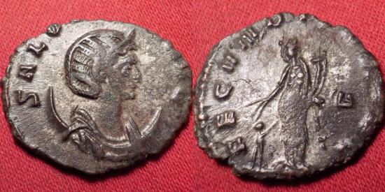 SALONINA AE antoninianus. Struck during the sole reign of Gallienus, Rome mint, 260-268 AD. SALONINA AVG, draped bust right on crescent. Reverse - FECVNDITAS AVG, Fecunditas standing left with hand over child left, holding cornucopiae, D to right. RIC 5, RSC 39a. 19mm, 2.2g. A decent example. Late, sole reign coinage of Gallienus & Salonina are rarely found with silvering. |