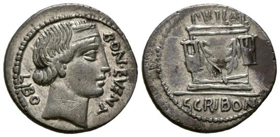 Definimos a la gens como un conjunto de familias que descendían o creían descender de un antepasado común y que tenían en común divinidades, costumbres y territorio. En el caso de la Scribonia es el brocal, perfil que lo rodea para dotarle de seguridad, del pozo (Puteal Escribonium o Scribonianum) el motivo iconográfico más utilizado en sus acuñaciones y hacen alusión a su construcción en el atrio de Minerva por parte de Escribonio, según relata Festo. Bonus Eventus, en el anverso, es la Diosa de la buena suerte y especialmente invocada en el inicio de un viaje. Existen variantes de esta pieza en función de si en lugar de tenazas en el reverso aparece un martillo o bien un cincel o buril en lugar de éstos.