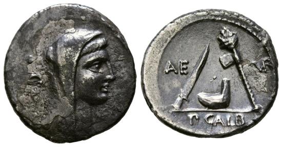 GENS SULPICE. Denarius. (Ar. 3.77g/19mm). 69 BC Rome. (Crawford 406/1; FFC 1135). Obv: Veiled head of Vesta right, Uncirculated behind. Rev: Sacrificial knife, simulus and priestly ax adorned with a lion's head, between: AE-CVR, in exergue: P GALB. Very Fine/ Almost Extremely Fine. Nice reverse.