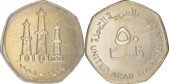 | | Coin, United Arab Emirates, 50 Fils, 1998/AH1419, British Royal Mint, | | | Value, Oil derricks above dates, Reduced size. | | FEATURES |