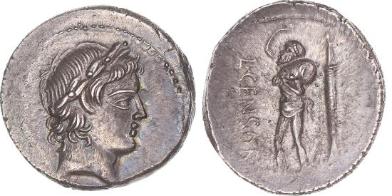 | | Marcia, Denarius, 82 BC, Rome, Silver, , Crawford:363/1 | | | Laureate head of Apollon, right., Marsyas, bald-headed, walking left, with right arm raised and holding wine-skin over left shoulder; behind, column bearing statue of Victory., L. Marcius Censorinus. Magnificent specimen, covered with a splendid cabinet patina of a bluish gray., L·CENSOR | | FEATURES |