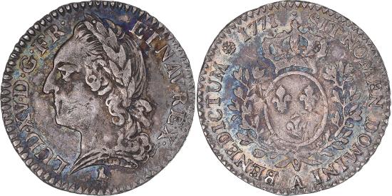 | | Coin, France, Louis XV, 1/10 Écu à la vieille tête, 12 Sols, 1/10 ECU, 1771 | | | Laureate head left., Crowned oval arms within oak leaf wreath., Nice bluish-gray patina. | | FEATURES |