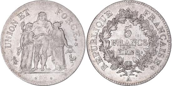| | Coin, France, Union et Force, 5 Francs, AN 8 (1799-1800), Paris, | | | Union et Force, Hercules group, Value within oak wreath, Dav. #1337., UNION ET FORCE <Bullet> * | | FEATURES |