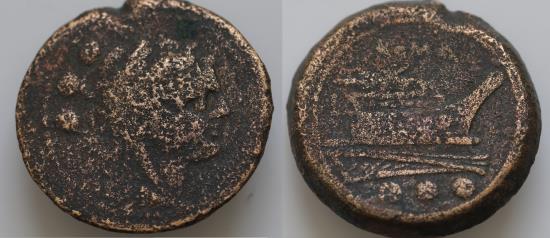 Anonymous. Circa 215-212 BC. Æ Quadrans (26mm, 16.82 g, 9h). Rome mint. Head of Hercules right, wearing lion skin; ••• (mark of value) behind / Prow of galley right; ••• (mark of value) below, ROMA above. Crawford 41/8b; Sydenham 106.