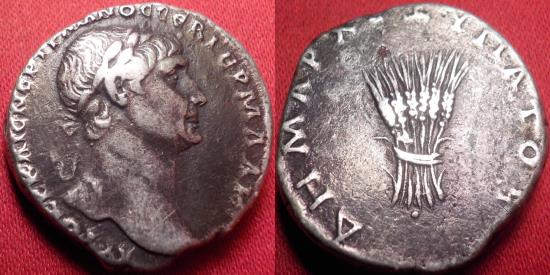 TRAJAN AR silver tridrachm. Arabia, Bostra, circa 112-114 AD. ΑΥΤΟΚΡ ΚΑΙС ΝЄΡ ΤΡΑΙΑΝΟС СЄΒ ΓЄΡΜ ΔΑΚ. laureate head of Trajan to right. Reverse - ΔΗΜΑΡΧ ЄΞ Υ]ΠΑΤO ς Bundle of six grain ears. RPC III 4063. 23mm, 8.9g.