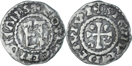 | | Coin, France, Maine, Herbert I, Denier, ND (1015-1246), Le Mans, | | | Monogram of Herbert., Cross with alpha and omega hanging., + COMES CENOMANIS, + SIGNVM DEI VIVI | | FEATURES |