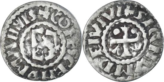 | | Coin, France, Maine, Herbert I, Denier, ND (1015-1246), Le Mans, | | | Monogram of Herbert., Cross with alpha and omega hanging., + COMES CENOMANIS, + SIGNVM DEI VIVI | | FEATURES |