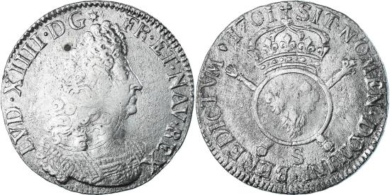 | | France, Louis XIV, Ecu, Écu aux insignes, 1701, Reims, réformé, Silver | | | Écu aux insignes, Armored bust right, Crowned arms of France with sceptre and hand of Justice behind | | FEATURES |