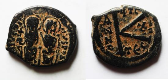 BYZANTINE. Justin II with Sophia, 565 - 578 AD, AE Half Follis