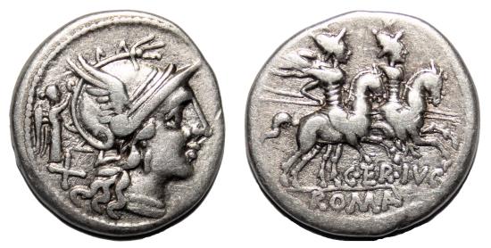 Obverse: Helmeted head of Roma right; X and Victory behind. Reverse: The Dioscuri riding right, C TER LVC below. EF-/VF+ condition, conserving complete details on both sides and bold reliefs. Very nice silver. Crawford 217/1. Rome mint, 147 BC. 3,6 g - 18 mm -------------------------------------------------------------------------------------------------- Visit our site about Numismatics and Archaeology: aeternitas-numismatics.com |
