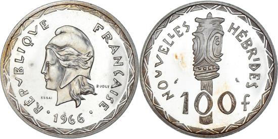 | | Coin, New Hebrides, 100 Francs, 1966, Monnaie de Paris, ESSAI, | | | Liberty head left, date below., Sword hilt above value., Some hairlines. | | FEATURES |