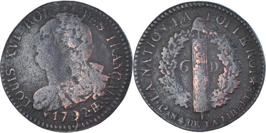 | | Coin, France, Louis XVI, 6 deniers français, 1792, Strasbourg, | | | 6 deniers français, Draped bust of the king on the left., Fasces topped by a Phrygian cap between two oak branches., LOUIS XVI ROI DES FRANÇAIS | | FEATURES |