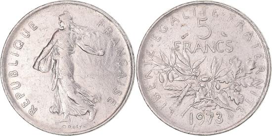 | | Coin, France, Semeuse, 5 Francs, 1973, Paris, , Nickel Clad | | | Semeuse, The Seed Sower, Branches divide denomination and date | | FEATURES |