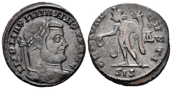 Maximianus Herculius. 286-305 AD. AE Follis (7.19 gm, 25mm). Siscia mint. Struck 309-310 AD. Obv.: IMP MAXIMIANVS P F AVG, laureate head right. Rev.: GENIO AVGVSTI/ ᴗ-Δ, Genius standing left, holding patera in right hand and cornucopiae in left; SIS in exergue. RIC 198a. gVF.