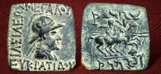 Baktria, Greco-Baktrian Kingdom. Eukratides I Megas. Circa 170-145 BC. AE Quadruple unit. 8.61gm, 21-21mm. Helmeted, diademed, and draped bust right / The Dioskouroi on rearing