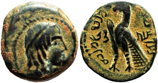 NABATAEA. Malichus I. 60-30 BC. Æ Unit (4.57 g, 1h). Petra mint. Dated RY 27 (34/3 BC). Diademed head right / Eagle standing left; date across field. Meshorer, Nabataea 15-6. gVF, attractive patina. Rare.