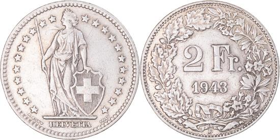 | | Coin, Switzerland, 2 Francs, 1943, Bern, , Silver, KM:21 | | | Standing Helvetia with lance and shield within star border, Value, date within wreath | | FEATURES |