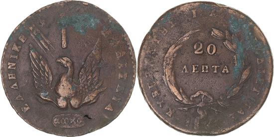 | | Coin, Greece, John Kapodistrias, 20 Lepta, 1831, Aegina, , Copper | | | Phoenix., Denomination within branches., Traces of verdigris. | | FEATURES |