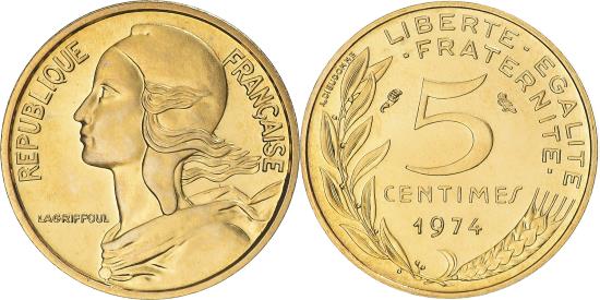 | | Coin, France, Marianne, 5 Centimes, 1974, Paris, , Aluminum-Bronze | | | Marianne, Liberty bust left, Denomination above date, grain sprig below, laurel branch at left, 1991-1993 dated coins, non-Proof exist in both coin and medal alignment., Henri Lagriffoul | | FEATURES |