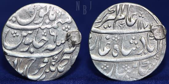 Independent States. Farrukhabad. emp. Ahmad Khan Bagash. AH 1164-1185 / AD 1750-1771. AR Rupee, In the name and types of the Mughal emperor Alamgir II (AH 1167-1173 / AD 1754-1759). Ahmadnagar Farrukhabad mint. Dually dated AH 1173. areas of peripheral weakness.