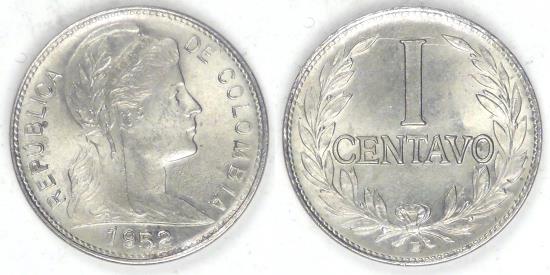 COLOMBIA - Republic, 1952 B, Centavo, Choice BU