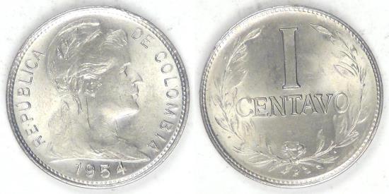 COLOMBIA - Republic, 1954 B, Centavo, Gem BU