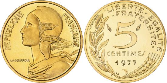 | | Coin, France, Marianne, 5 Centimes, 1977, Paris, série FDC, | | | Marianne, Liberty bust left, Denomination above date, grain sprig below, laurel branch at left, 1991-1993 dated coins, non-Proof exist in both coin and medal alignment., Henri Lagriffoul | | FEATURES |